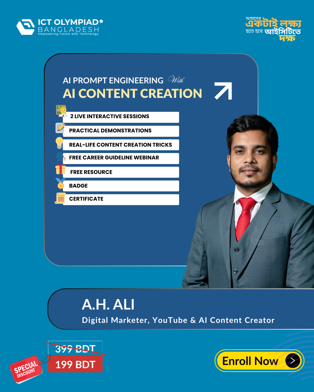 AI Prompt Engineering with AI Content Creation is a specialized training program designed for students, aspiring creators, and digital learners who want to develop practical skills in using AI for modern content creation. The course focuses on helping participants understand how to communicate effectively with AI tools, write smart prompts, and generate impactful digital content for academic, professional, and creative purposes. Through 2 live interactive sessions, learners will gain hands-on experience with practical demonstrations, real-life content creation strategies, and essential techniques used in today’s AI-driven digital world. The program also includes a free career guideline webinar, along with free resources, badge, and certificate opportunities to support learners in their future growth. The course is conducted by A.H. Ali, Digital Marketer, YouTube & AI Content Creator.