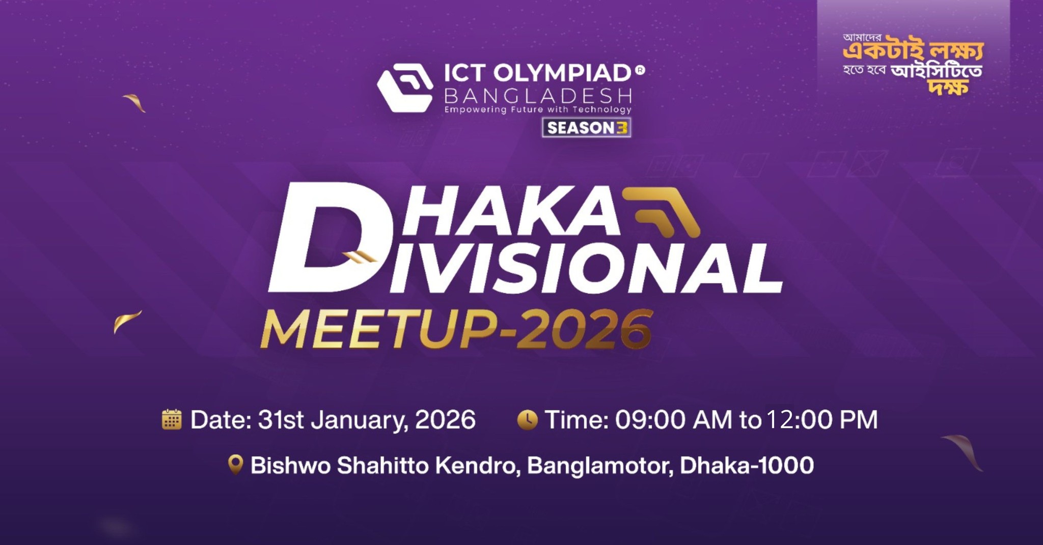 📢 Dhaka Divisional Meetup 2026 🚀 ICT Olympiad Bangladesh 📍 Venue: Bishwo Shahitto Kendro, Banglamotor, Dhaka 🗓 Date: 31 January 2026 Join us for an inspiring meetup focused on youth, technology, and innovation. Stay connected. Stay future-ready.